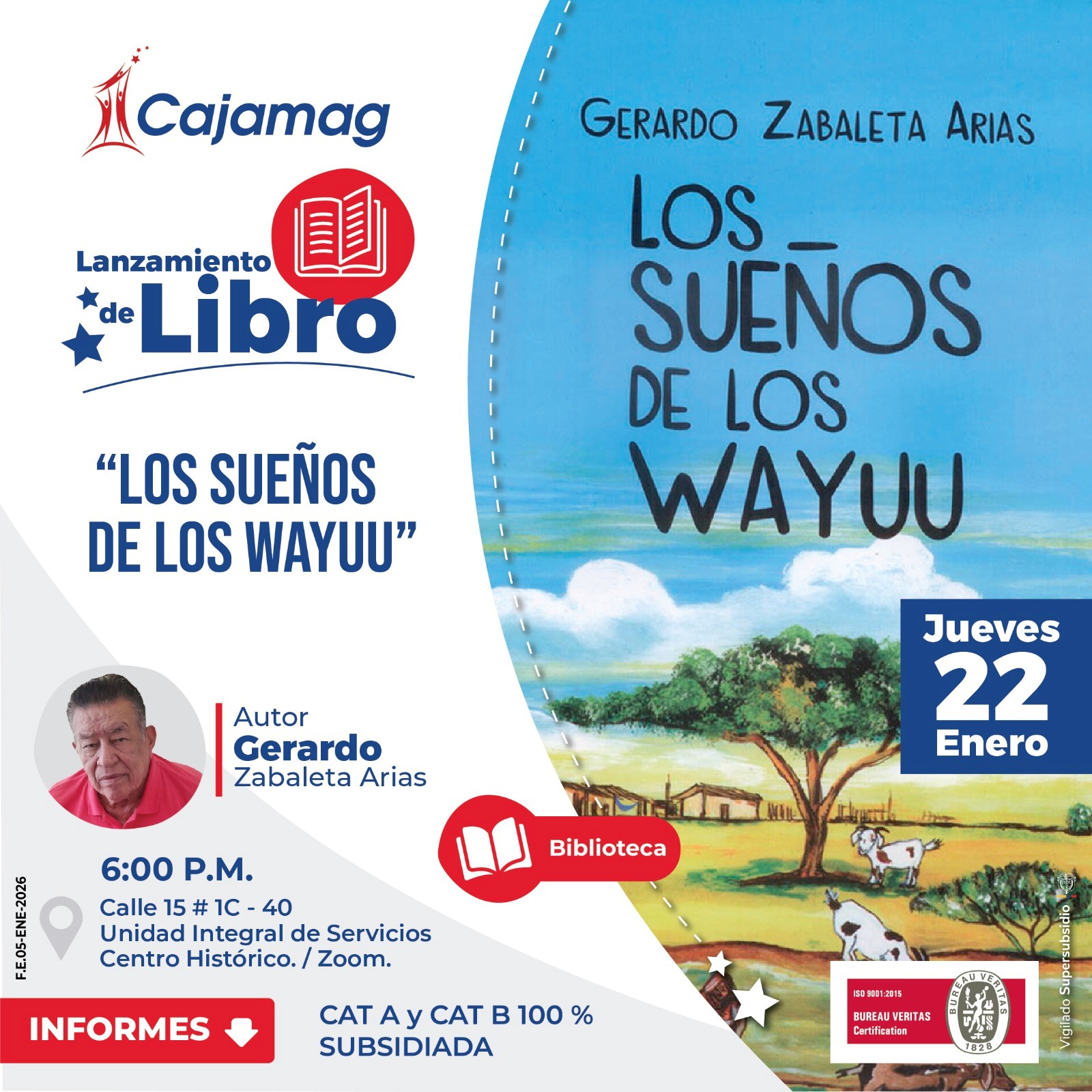 La Caja de Compensación Familiar del Magdalena – CAJAMAG, a través de la Biblioteca, invita a sus afiliados y comunidad en general al lanzamiento del libro “Los Sueños de los Wayuu”, obra del escritor Gerardo Zabaleta Arias, que se llevará a cabo el jueves 22 de enero de 2026, a las 6:00 p.m., en la Unidad Integral de Servicios – Centro Histórico, ubicada en la Calle 15 # 1C – 40.