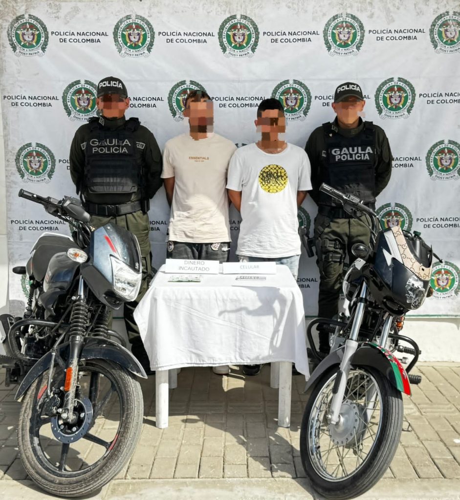 Uniformados del grupo GAULA captura dos presuntos integrantes de las Autodefensas Conquistadores de la Sierra por extorsión a comerciantes, incautándoles dos motocicletas, dinero y un celular.