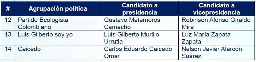 Tras el cierre del periodo de inscripción de candidaturas y promotores del voto en blanco para las elecciones presidenciales del 31 de mayo, la Registraduría Nacional del Estado Civil informa que se inscribieron un total de 14 candidatos con su respectiva fórmula vicepresidencial