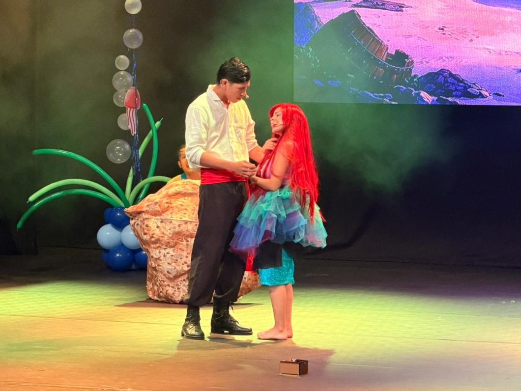 Desde que se abrió el telón, el teatro se llenó de color, música y emoción. Los personajes del clásico cuento cobraron vida en el escenario con coreografías dinámicas, canciones y una escenografía que recreó el mundo submarino donde se desarrolla la historia.